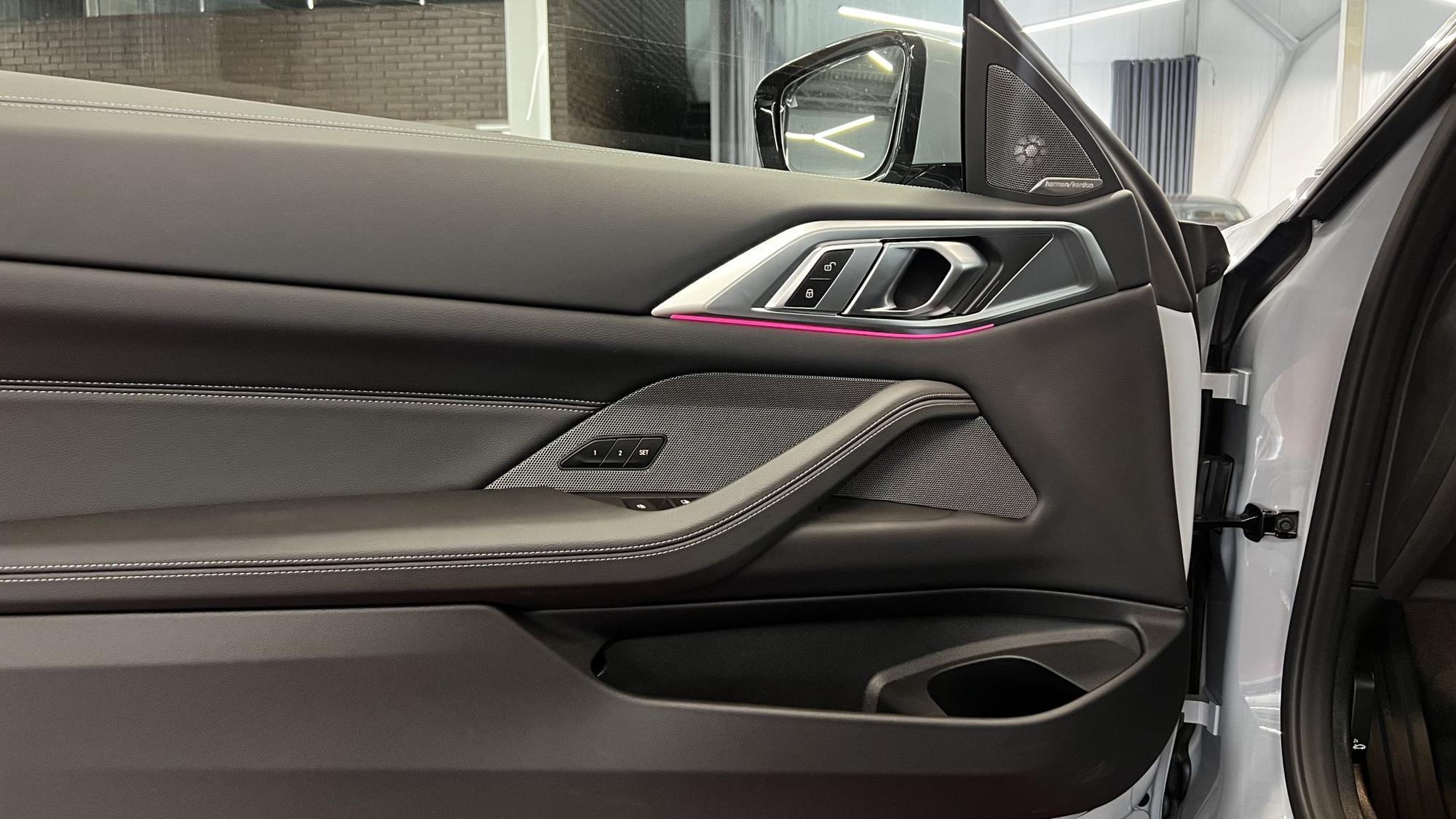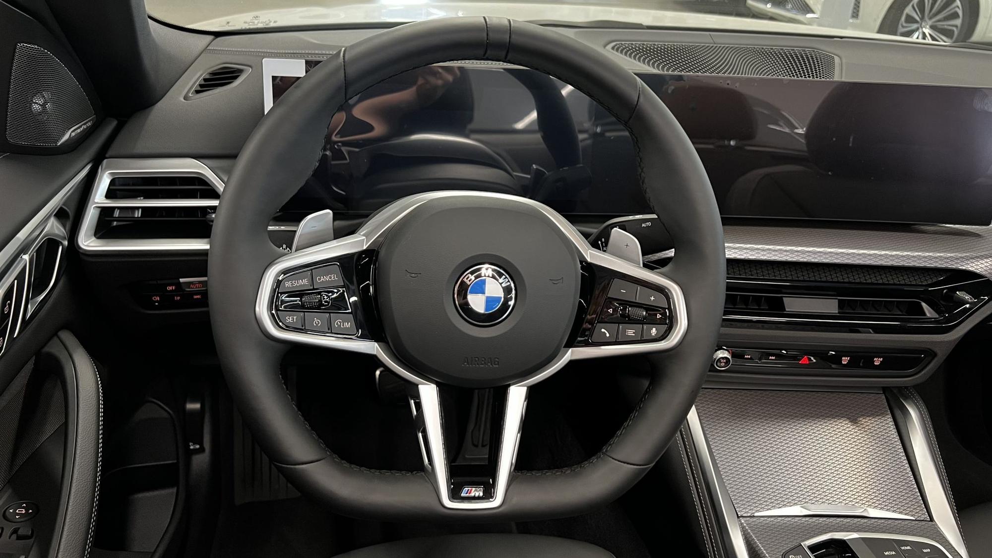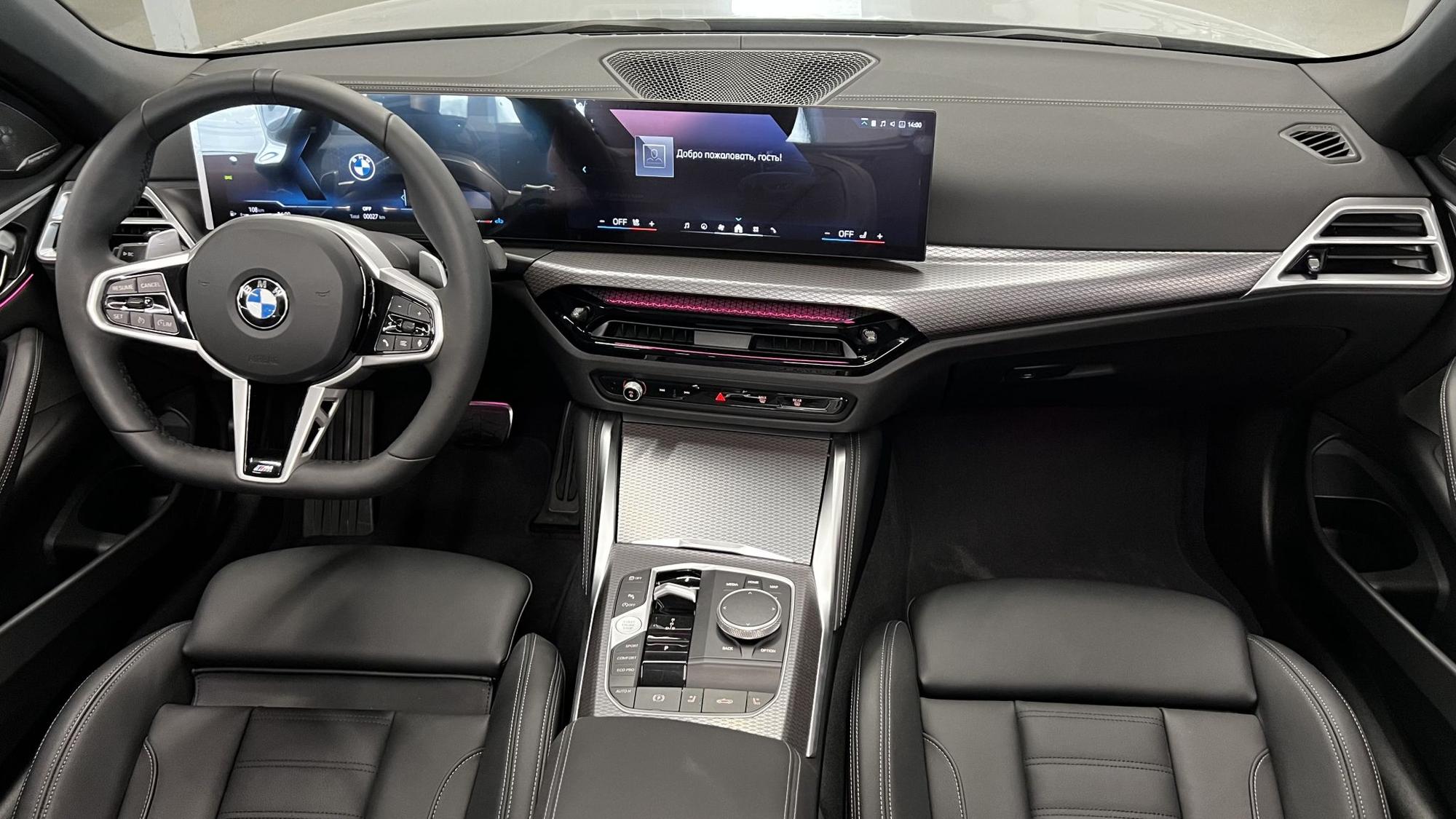 Салон BMW 4 серии 2024 года — это сочетание премиальной отделки, современных технологий и продуманной эргономики. Серый цвет кузова дополнен тёмным интерьером с контрастными светлыми вставками, выполненными из мягкой кожи и матовых металлических элементов. Такая комбинация придаёт салону сдержанную элегантность и визуальную глубину, подчёркивая спортивный характер модели.